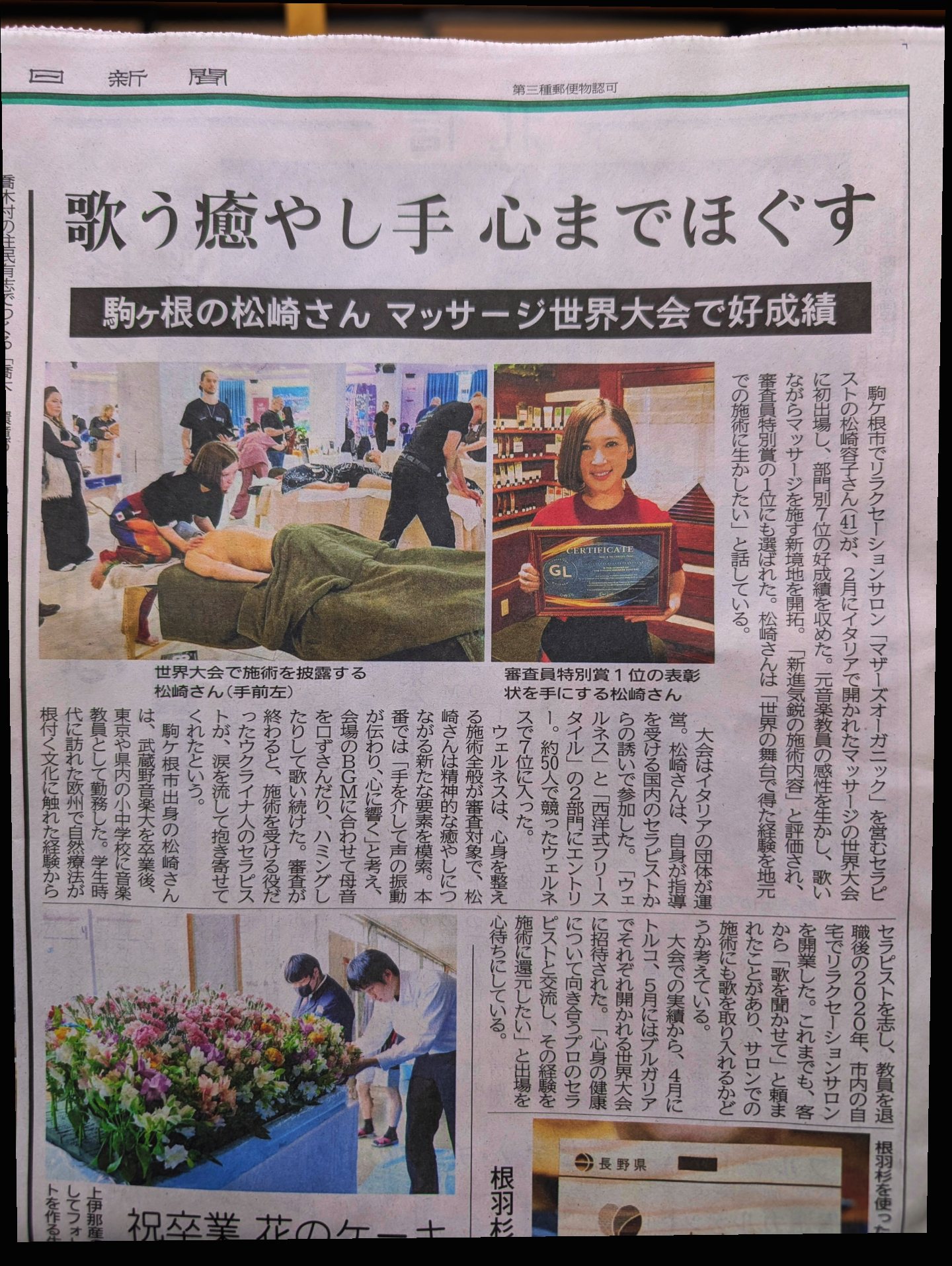 2月にイタリアで開かれたマッサージの世界大会に初出場し、部門別7位の好成績を収めた。元音楽教員の感性を生かし、歌いながらマッサージを施す新境地を開拓。「新進気鋭の施術内容」と評価され、 審査員特別賞の1位にも選ばれた。松崎さんは「世界の舞台で得た経験を地元での施術に生かしたい」と話している。